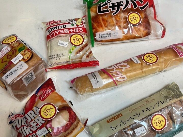 その後、折り返して自宅に戻る途中にある食品や日用品を売っているドラックストアに入ってみると、なんとワゴンにどっさりと割引シールの貼られているパンが置かれていました!