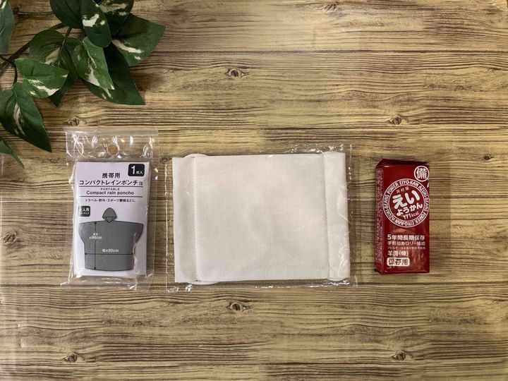 ・携帯用コンパクトレインポンチョ(災害時雨が降っているかもしれませんし、着ると温かいので防寒対策用としても!)
