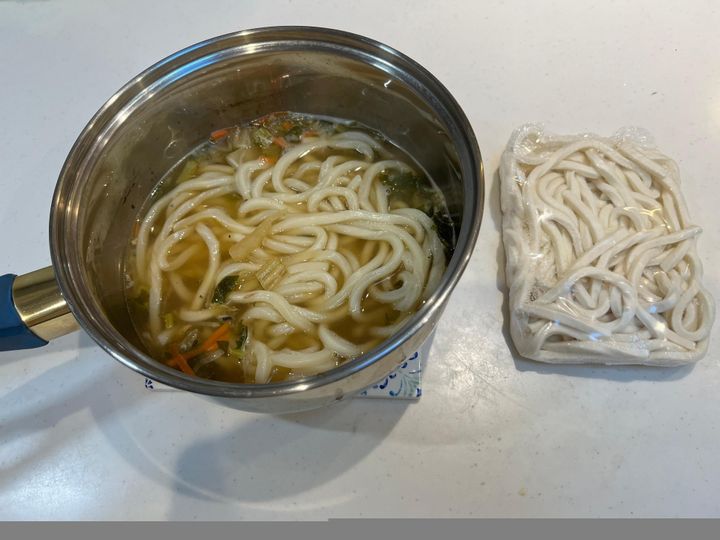 我が家は冷凍うどんをチンして投入、煮込みうどんして食べます!