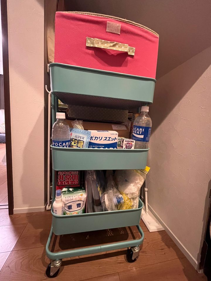 現在はこの3段ワゴンに備蓄品や防災アイテムを入れています。