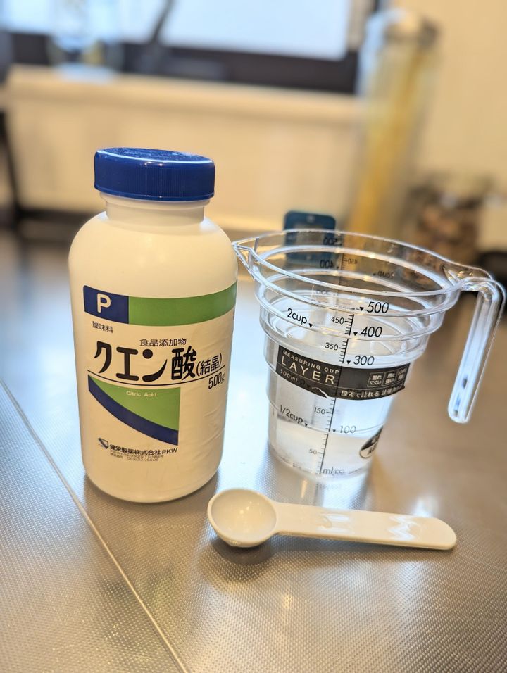 水100mlに対して、クエン酸小さじ1です。材料はこれだけ。