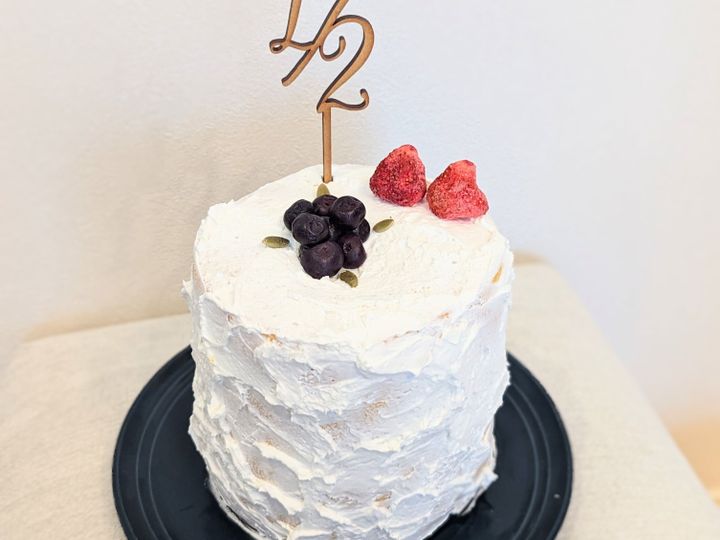⑤ブルーベリーやドライフルーツ等で飾り付けて完成。1/2のケーキトッパーはAmazonで買いました。