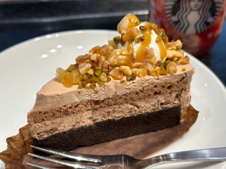 ケーキ部分はチョコレートクリーム、ココアスポンジ、ガトーショコラという、チョコ尽くしで贅沢な一品。ケーキ上部には4種類のナッツ、ホイップクリーム、さらにキャラメルソースまで…!4種それぞれ大きさの異なるナッツの歯応えも良いアクセントになっていました。