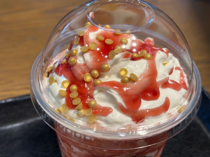 まず上面に散りばめられたキラキラゴールドのチョコレートが宝石のようでかわいい!!!一口飲むと苺の果肉がゴロリと飛び込んできます!苺の甘酸っぱさと種のプチプチ食感がたまらない…!しっかり甘いけど、程よい酸味のおかげであっという間に飲み干してしまう美味しさでした。同じくホリデー限定のホットドリンク『ストロベリー&ベルベットブラウニーモカ』も必ず飲もうと心に誓いました。