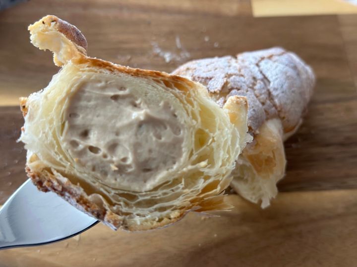 クッキー生地のさっくり、クロワッサンのしっとり、クリームのなめらか食感がマッチ。