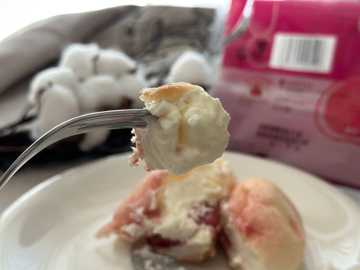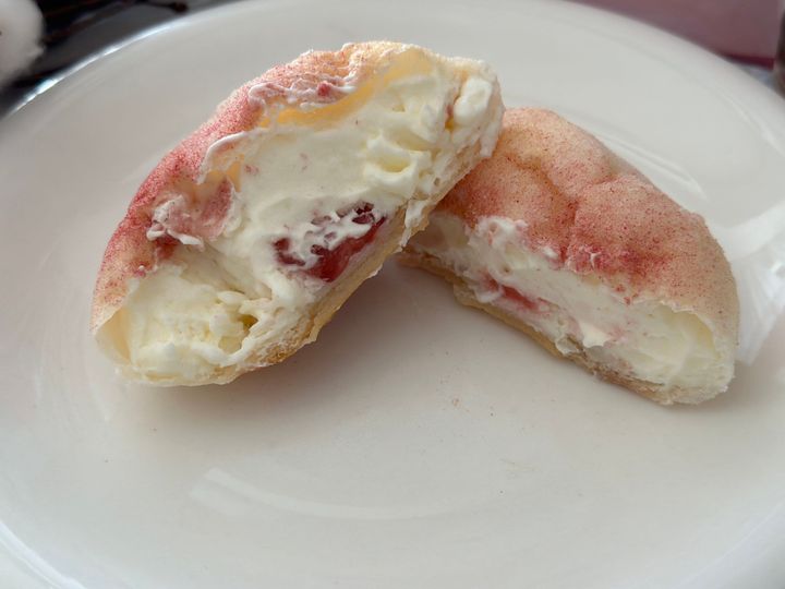 半分に割るとたっぷりの苺ソースとあふれんばかりのホイップクリームが…!