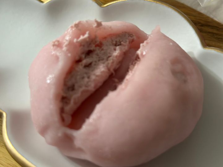 大福の中には苺のプチプチ食感が楽しい苺クリームがたっぷりと詰まっています。苺クリームは洋菓子のようなふわシュワ溶ける軽いホイップではなく、良い意味でずっしりとした食感のクリームでした。