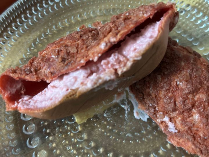 中の苺クリームは小さめの果肉がゴロゴロ入っており、柔らかい果肉と種のプチプチ食感が美味。程よく酸味が効いていますが、シュー生地がしっかり甘いので、酸味と甘味がちょうど良い具合です。