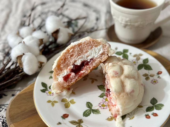 白いクッキー生地にはピンク色のストロベリーチップが散りばめられており、見た目も最高にかわいいメロンパン。