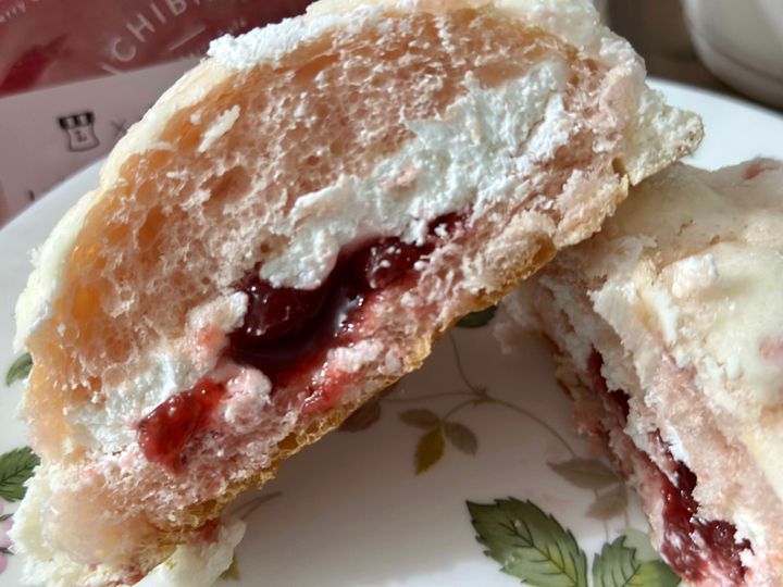 半分にカットしてみるとたっぷりのホイップと苺ソースがとろり。