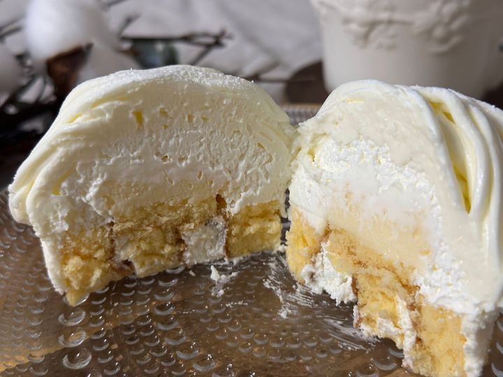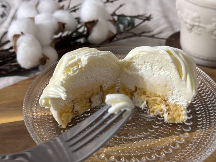 半分に切ってみると、上からチーズクリーム、ホイップクリーム、ベイクドチーズケーキ、ロールケーキというなんとも贅沢な4層仕立て。