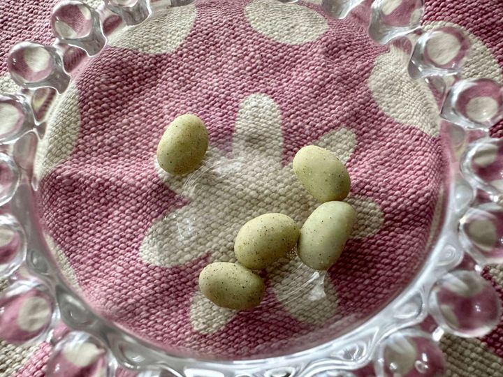 半分に割ってみると「あずきの甘納豆」の周りにはたっぷりの「ホワイトチョコレート」がしっかりコーティングされているのがわかります。さらにホワイトチョコの周りには「桜葉パウダー」が。