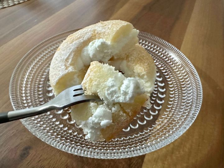 ナイフを入れると、フィナンシェはずっしり、クリームはシュワっとした質感。