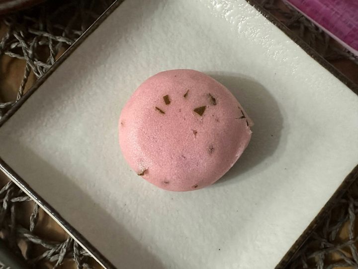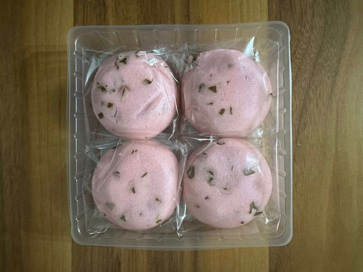 個包装を開けると桜餅の香りがふんわり。しっかりとピンクに色づいたおまんじゅうが華やかで春らしい印象。おまんじゅうの生地には国産の桜の葉がたっぷりと練り込まれています。