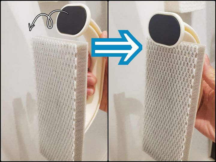 使い終わったら取っ手の下部分をカチっと押すと、手持ち部の角度が代わり、壁にくっつくのです!