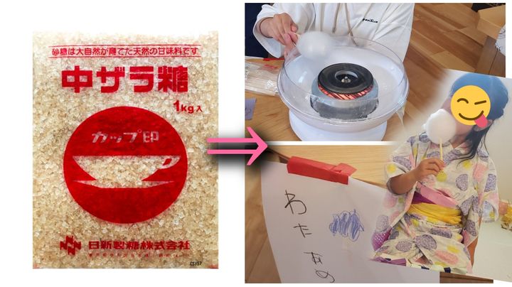 ・わたあめ → 市販のわたあめ機と、ザラメ。