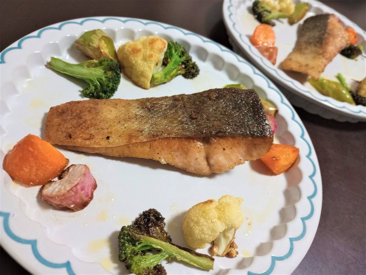 余った野菜とスーパーで安かった秋鮭をフライパンで揚げ焼きにしただけですが、何となくおしゃれに見えてテンションが上がります。