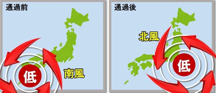 そして低気圧が通過する際、通過前には南風が吹いて気温が上がるものの、通過後には北風が吹いて気温が下がります。