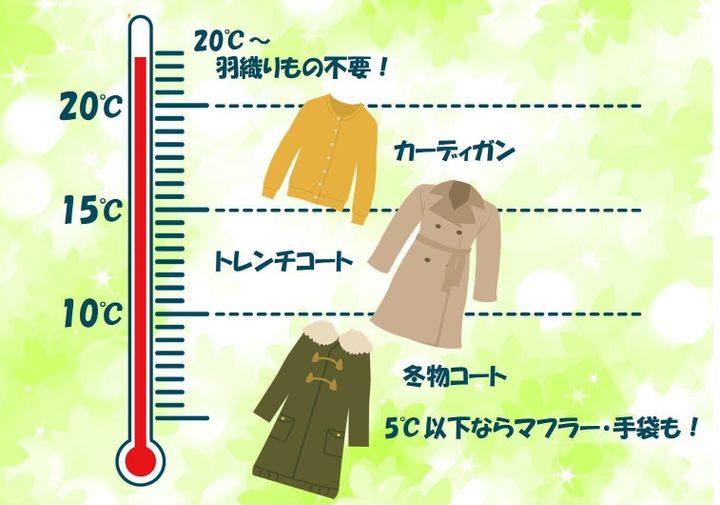 気温が10℃以下のときは冬物の厚めのコート、10℃~15℃ならトレンチコートなど薄い春物の上着、15℃~20℃ならカーディガンを羽織るのがおすすめで、20℃を超えたらもう基本的に上着は要らなくなります。