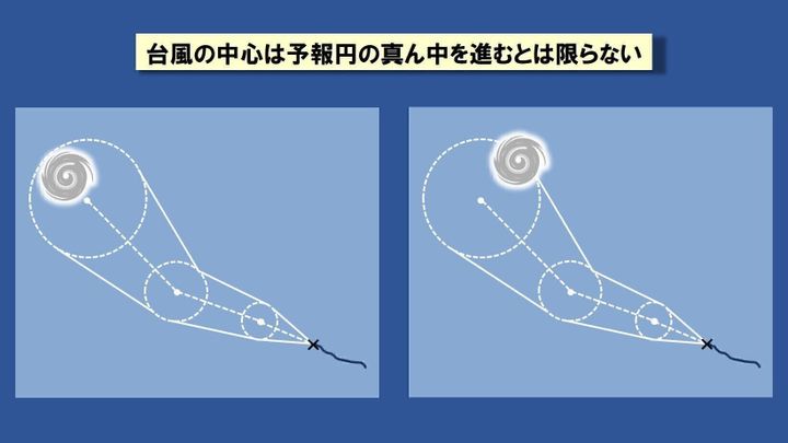 あくまで台風の「中心」が予報円の中のどこかへ進む、というだけの話ですから、もし台風中心が円の端っこのほうへ進んだ場合、予報円の外でも台風本体による暴風や豪雨に見舞われることになります。