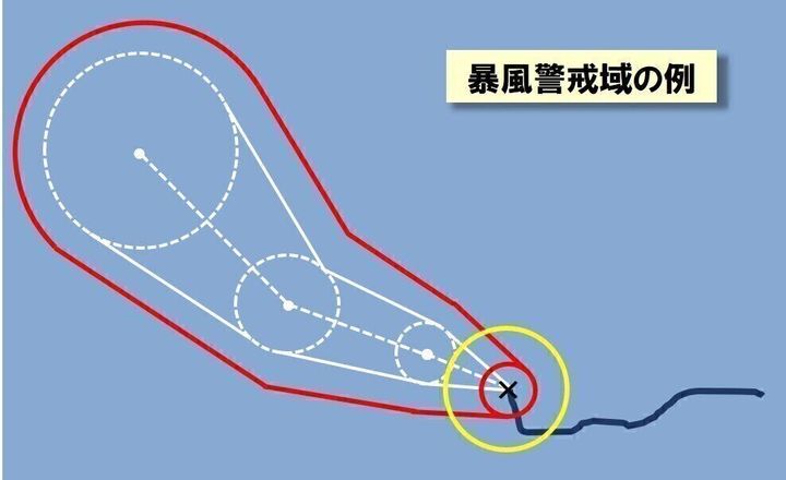 「暴風警戒域」は、「この赤い円に含まれる地域は、台風の暴風域に入る可能性が高いです」と教えてくれるもの。