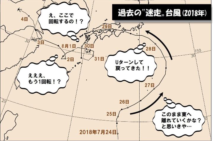 テレビやネットで台風情報を見ていると、なんだか台風が行ったり来たりしていたり、当初予想されていた経路とはまったく違うところを進んでいたりと、まるで迷走しているような印象を受けることがあります。
