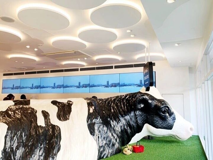 『MILKLAND』はガラス張り。1階から2階に突き抜ける大きさの牛のオブジェが置かれていて、通りの中でかなり目立っています。