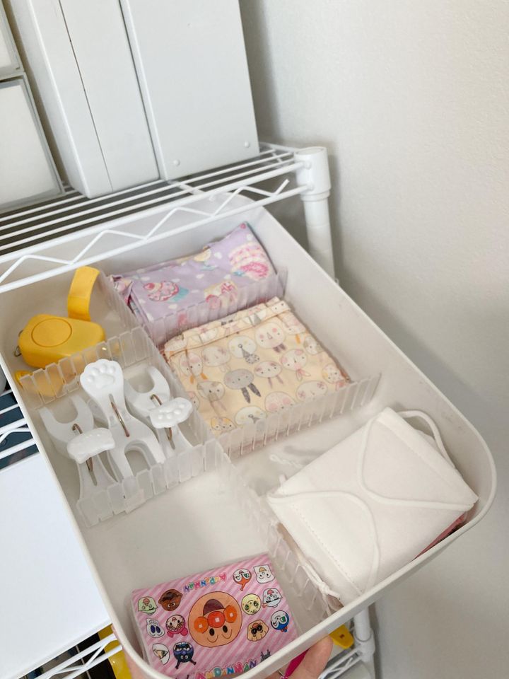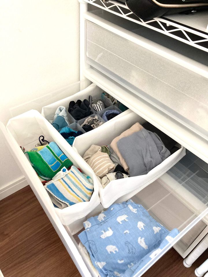 引き出しの中はセリアの不織布ケースで仕切り、子供が使いやすいよう、ざっくり分けて収納しています。