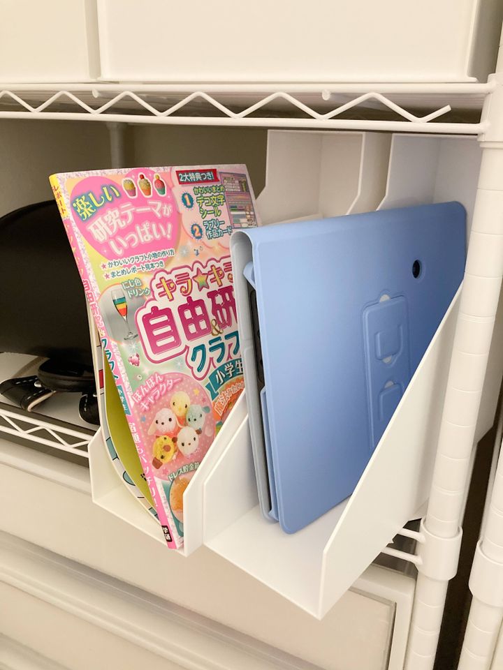 体操服袋やシューズ袋はニトリのNインボックスにポイポイ収納。教科書はニトリのA4ファイルスタンドに立てて収納しています。マスクなどの細々したものは、無印良品のやわらかポリエチレンケースに仕切りをつけて収納しています。