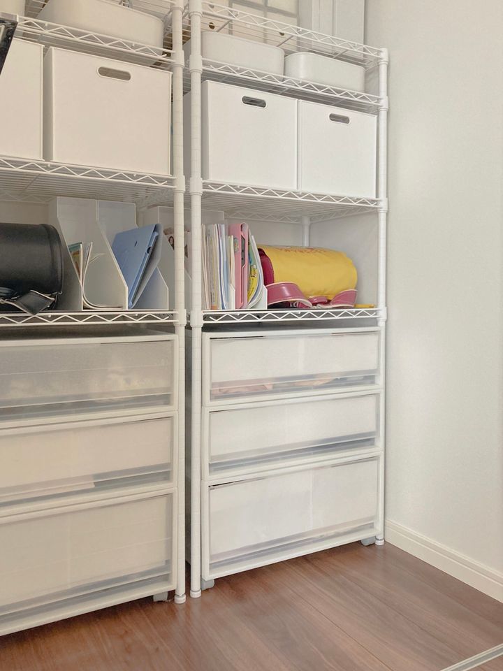 一年生のうちは子供だけでなく、親も一緒に持ち物を確認しながら準備をする事もあるため、リビングに子供収納を設けることは子供、大人、どちらにも快適な収納になるなと見直しをして実感しました。