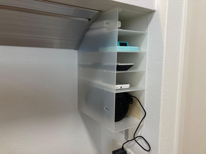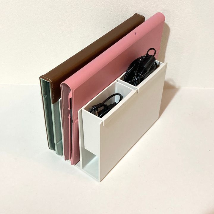 ポリプロピレンファイルボックス用ポケットとスチロール仕切りスタンダドを組み合わせた収納方法が大活躍。スチロール仕切りスタンドにタブレット収納し、ファイルボックス用ポケットに充電コードを収納しています。