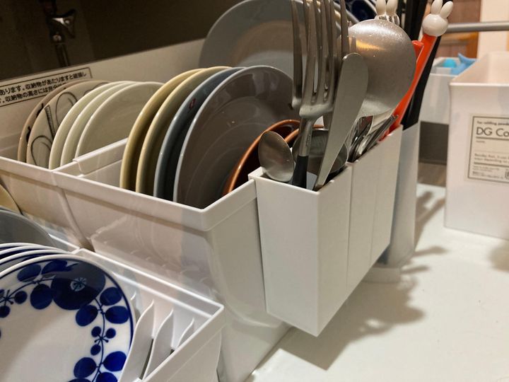 ファイルボックス用ペンポケットはカトラリーの収納にぴったり。食器を収納しているボックスの縁に、掛けて使用しています。