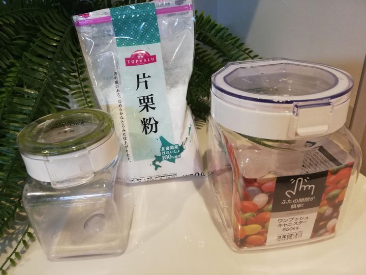 今回は片栗粉に使いたくて購入しました。いままではTAKEYAフレッシュロック300ml(左)を使用していたのですが、一袋入りきらなかったのでニトリに売っている850ml(右)に買い替えました。私は砂糖や塩もワンプッシュキャニスターを使用しています。この商品のよいところは本体とフタが繋がっているので、フタを外して下に置くということをしなくてよいのでワンプッシュで取り出すことができます。また手が入る大きさなので、量が少なくなっても取り出しやすく洗いやすい。上から見ても横から見ても透明なので、ひと目で残量がわかるし、ラベリングしなくても中身がわかるところが好きです。フレッシュロックと使い勝手は変わりませんが、フレッシュロックの方はフタにロック機能があり自立するので、我が家ではフレッシュロック300mlにゴマを入れスプーンなくても傾けて使用することができます。あとはフタのデザインが少し違う程度です。