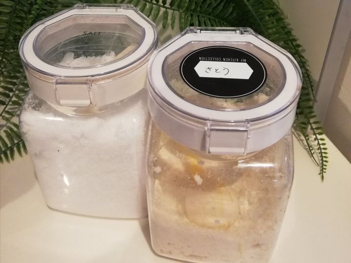 砂糖や塩を調味料ケースに移し替えて使用している人は多いと思いますが、一袋全部入るサイズがおすすめです。何故かというと半分くらいしか入らないケースを使うと残った調味料の袋をクリップでとめて、またそれを管理するスペースが必要となってくるからです。スペースがあまりないキッチンの人は、全量入るケースに変えると置き場に困らなくてすむと思いますよ。また透明で中身がわかりやすいですが、塩と砂糖(上白糖の場合)見た目が似ていて子ども達が見間違うことがあるためラベリングしています。基本てんさい糖(750g)を常備しているので色でわかります。ちなみに砂糖と塩は1.1Lを使用しています。普段購入している調味料より少し容量が大きいものを選ぶとスプーンを入れるスペースが出来ますよ。