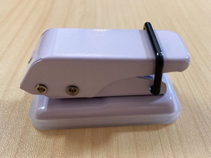 こちらもコンパクトでかわいい穴パンチです。穴は1つ開けられます。色も同じくパープルを購入。穴は約コピー用紙10枚分開けられます。