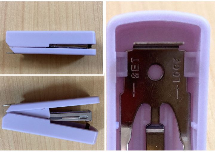 まず見た目がとてもかわいい!一見ホッチキスには思えないです。色がピンク、パープル、ミントと3色あり私はパープルを購入しました。