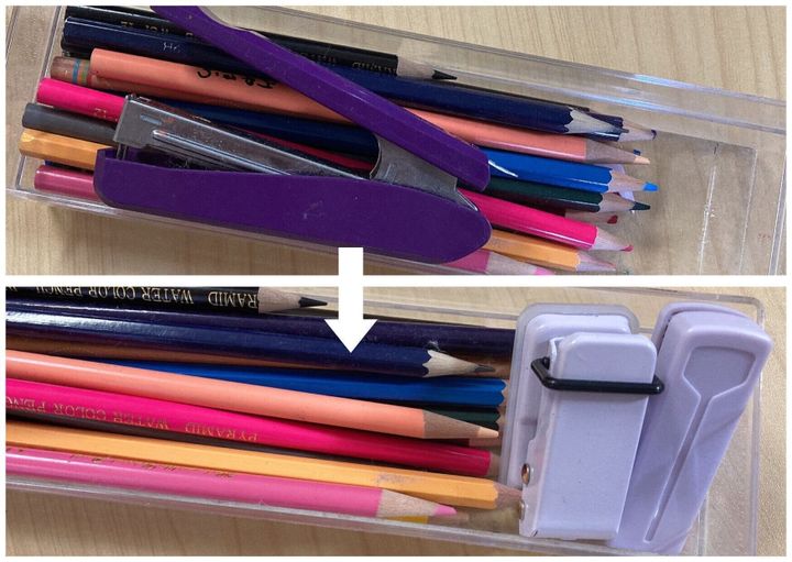 今まで筆記用具と一緒にホッチキスを収納していましたが、鉛筆を出すときとても邪魔でした。穴パンチはもちろん入らないので別のところに収納。どこに収納したかわからなくなることも。