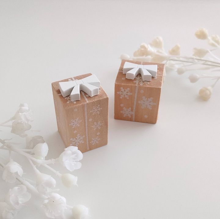 ナチュラルウッドのギフトボックスに、白いリボンと雪の結晶の柄が、クリスマスらしくてとても可愛いデザインです。