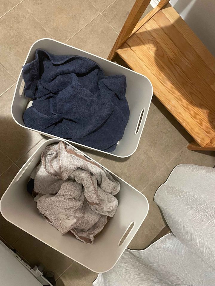 今では部屋中の全ての「タオル」に関しては一切畳んでいません。子どもたちの習い事用ユニフォームもしわにならない、テロンっとした素材。どちらもそれぞれの収納箱にぽいっとするだけなので、心の負担が一度に楽ちんになりました。
