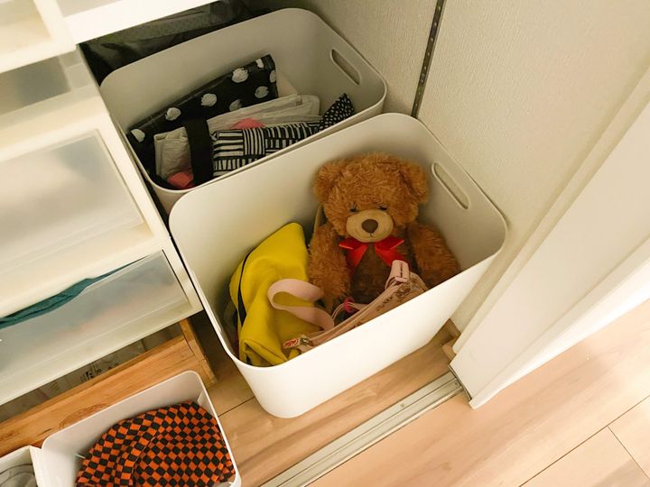 中身が空っぽになったサブバックは収納BOXにポイポイッと投げ込むだけ。クローゼットの手前が子ども達のバック入れ。奥は親が使うサブバック入れに。