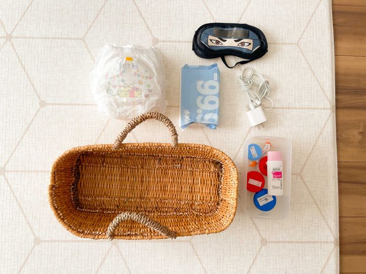 オムツ収納として使用しているカゴの中身を、今回全て出してみました。並んだアイテムは、
