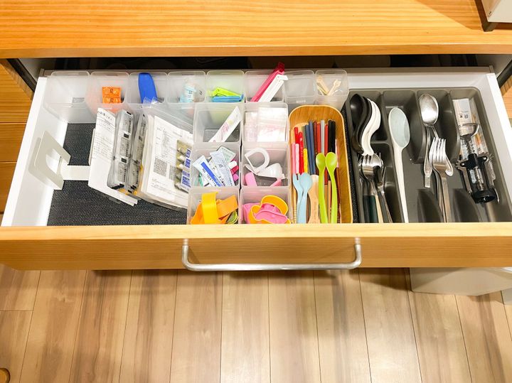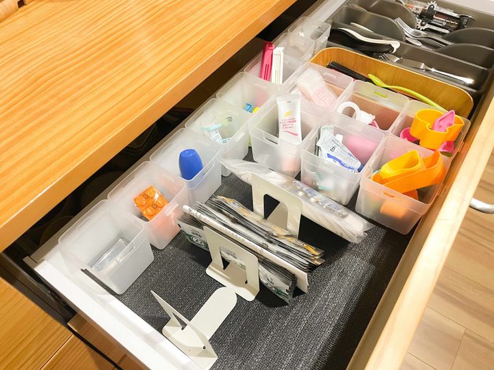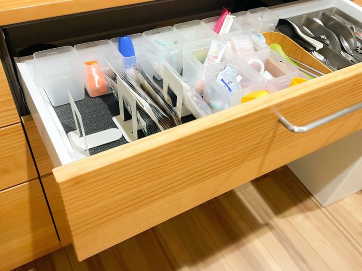 使用頻度を考えてモノを移動。空いたスペースに100均一のSeriaやDAISOで取り扱いのある「くつした整理カップ」を使い小分けスペースを作りました。薬を人別、種類別に区分けできるので、薬残量も一目で把握できます!