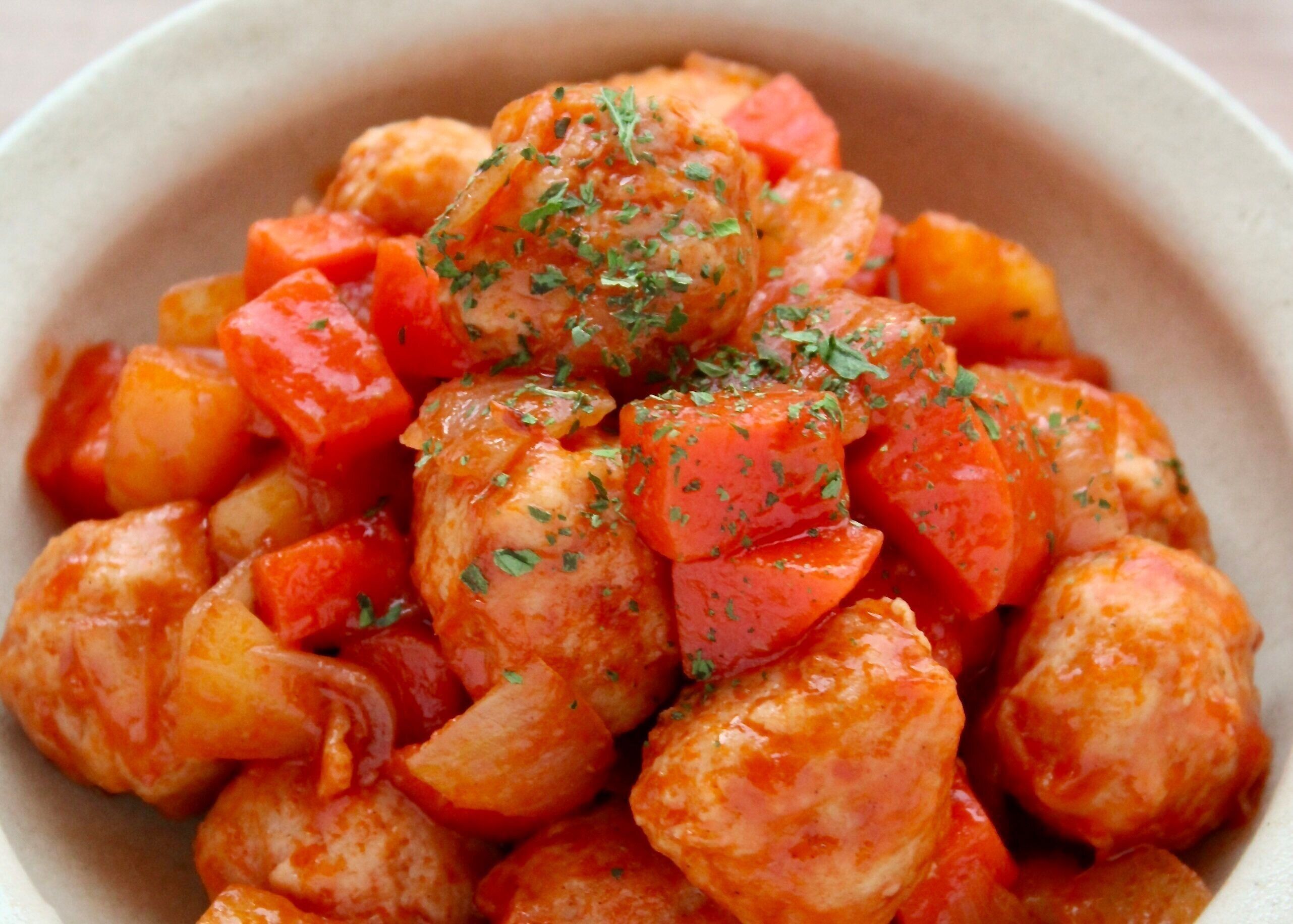 今回は、キムチを使って野菜を増量した、エビチリ風の中華惣菜をご紹介します。