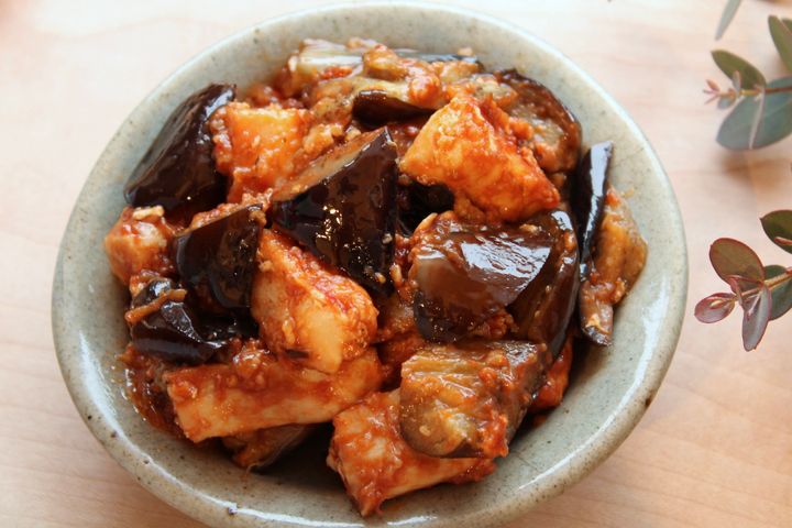 3 フライパンを弱めの中火に熱し、ごま油とニンニク、生姜を加える。2となすを加え、表面が焼けたら裏返す。