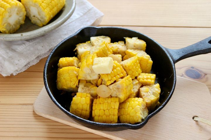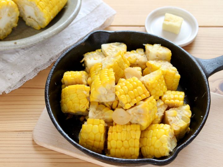 1. 大きめの鍋に2リットルの水を入れて沸騰させ、塩を入れる。再沸騰したらとうもろこしを加え、10分ほど茹でる。