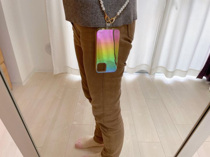 長さの調節はできませんが、身長が160cmくらいだとスマホが腰のあたりまで届きます。