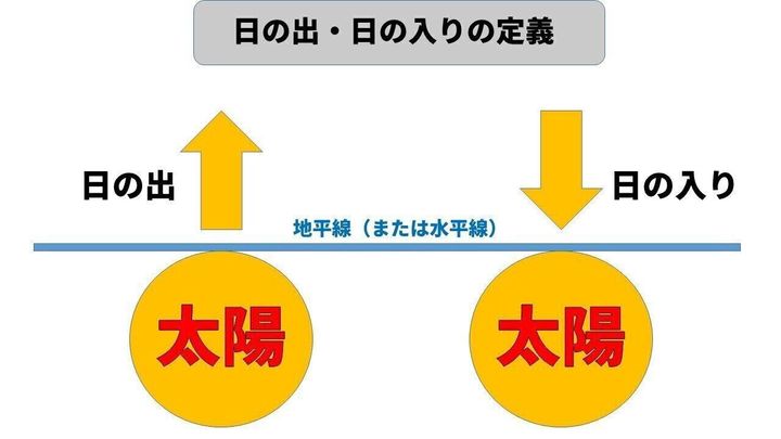 つまり、日の出は太陽が地平線から顔を出し始めた瞬間、日の入りは太陽が地平線に沈みきって見えなくなった瞬間となります。