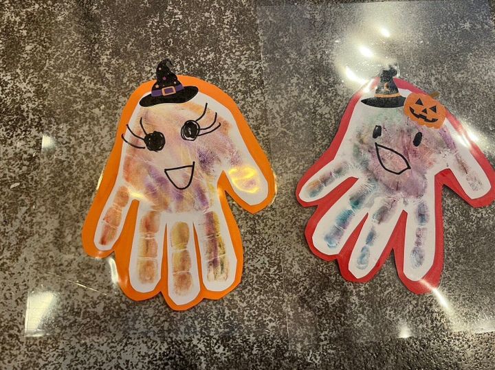 手のひらがおばけの顔になるので目や口を書いたり、