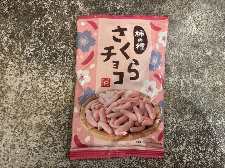 かわいらしいピンク色のほんのり塩気のある甘いさくらのホワイトチョコと、柿の種の組み合わせが絶妙で食べる手が止まらない危険なお菓子です。