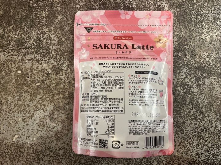 ローカフェインとは、カフェイン検出量が飲み方100miあたり1〜13gの商品のことを指すそうで、こちらのさくらラテは1杯分(約8g)あたり3mgのカフェインが含まれているそうです。